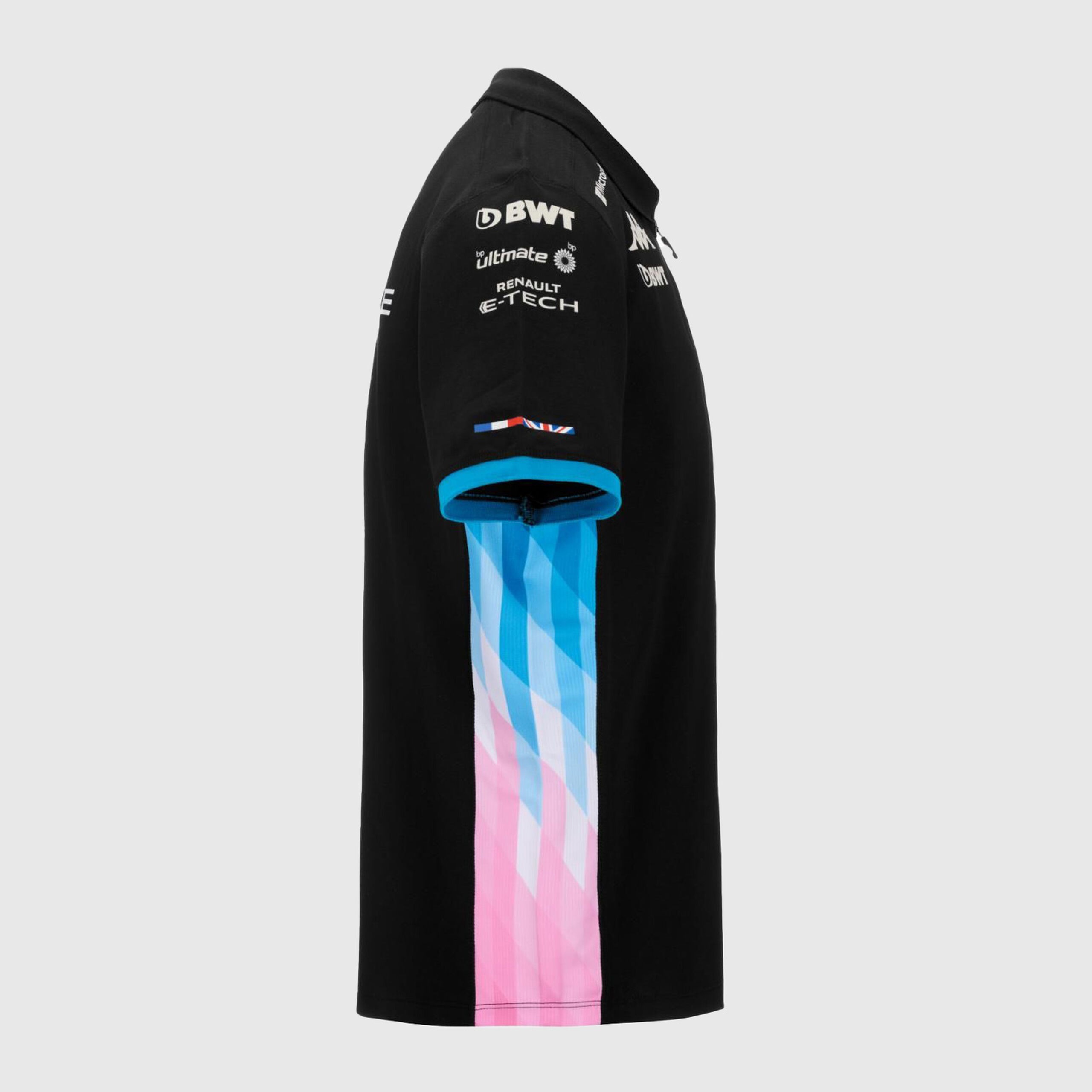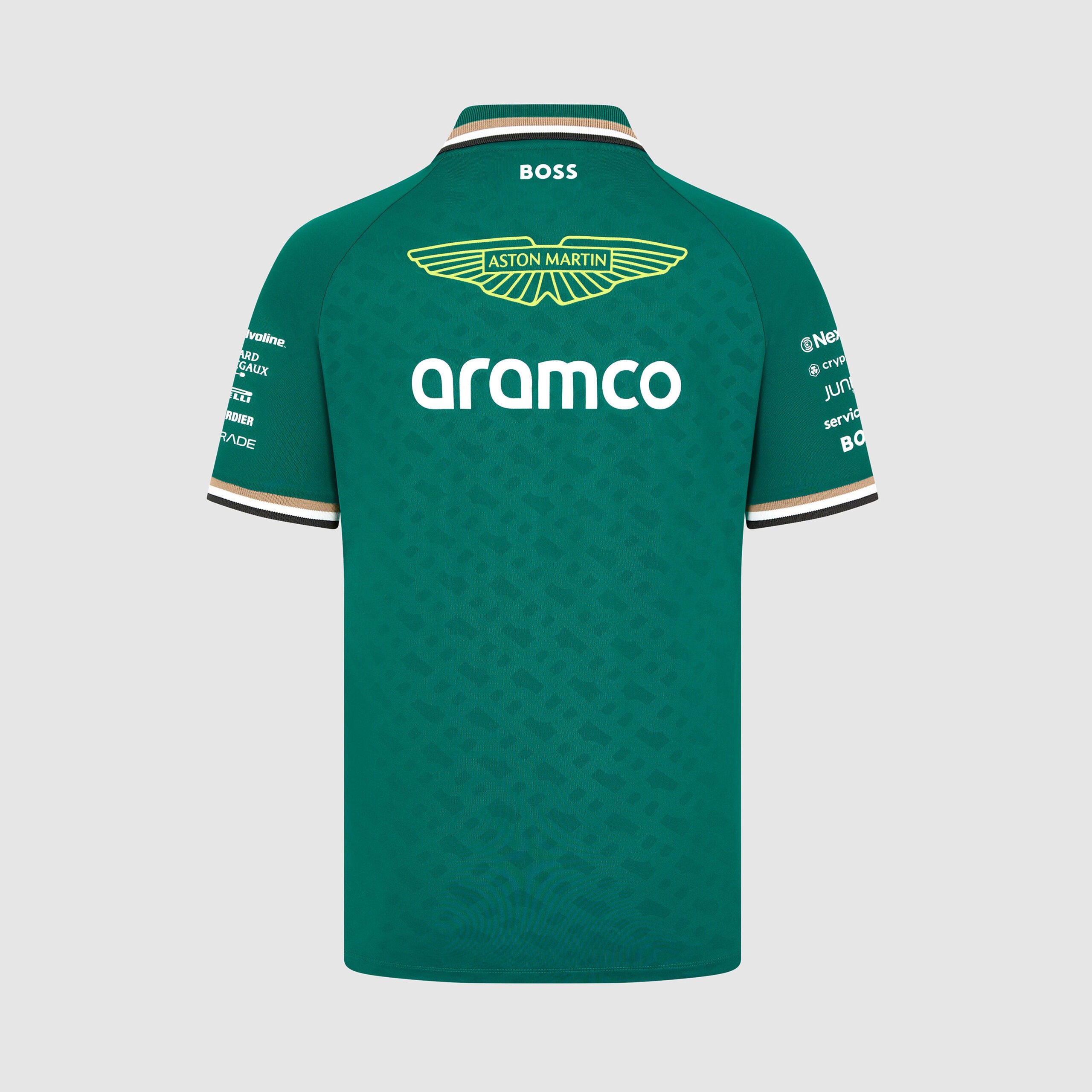 The official 2024 Team Replica Polo, as worn throughout the Formula One® season. True to form, no detail has been spared in the pursuit of the ultimate Team Polo, from the embossed tonal monogram fabric print with zip up polo collar and ribbed sleeves, through to the precision printed Aston Martin Aramco Formula One® Team and sponsor branding.