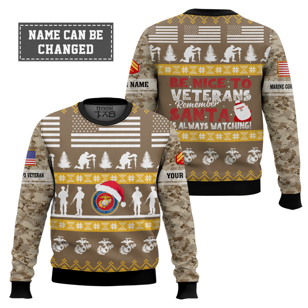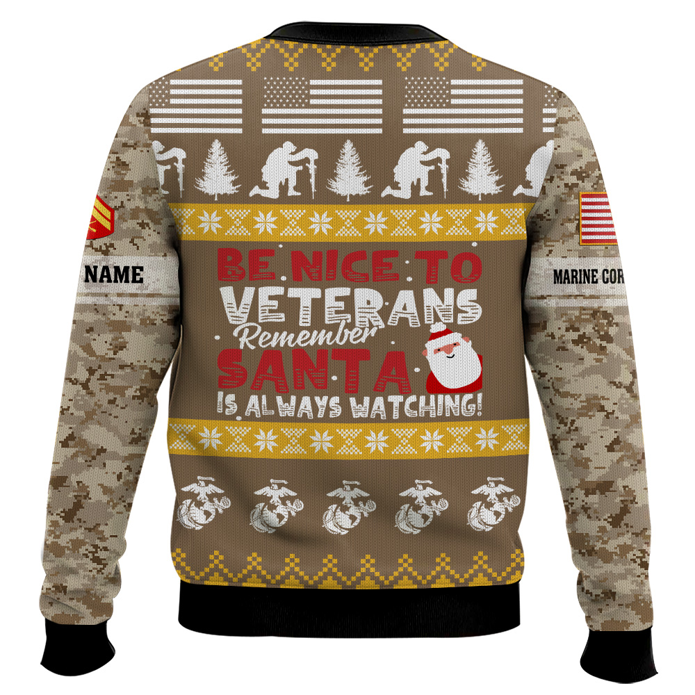 US Marine Corps Be Nice To Veterans Remember Santa Is Always Watching – Custom Name And Rank Ugly Sweater